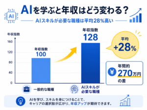 データ分析を行っているアメリカのLightcast社は、AIを学ぶことで上昇する年収の見込みを調査しました。調査によって、AIスキルが必要な職種の年収は他よりも平均28%高いことや年間約270万円の差があることが分かりました。