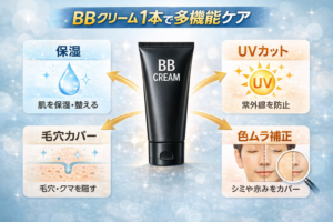 BBクリームは、化粧下地やファンデーション、保湿、UVカットなどをひとつにまとめた多機能のベースメイクの商品です。朝に何種類も重ねなくてよいので、メンズメイク初心者でも続けやすいです。