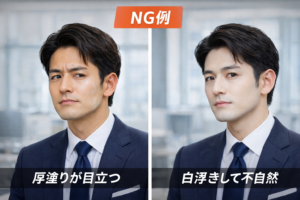 職場で浮きやすくなるメンズメイクのNG例として有名なのが、BBクリームやファンデーションの厚塗りです。塗り重ねるほど崩れやすくなるので、昼過ぎにはヨレやムラが目立ってしまいます。